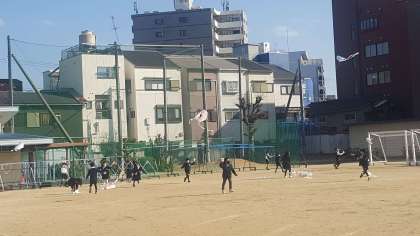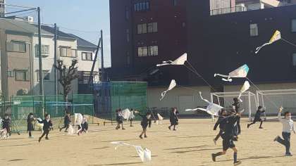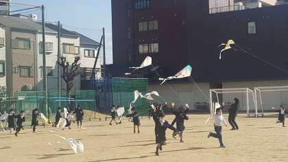 1年生が午前中に作っていたたこを5時間目に揚げました。残念ながら風が弱く、走っている時だけ揚がっていました。それでもみんな一生懸命に汗をかきながら、楽しくたこを揚げていました。