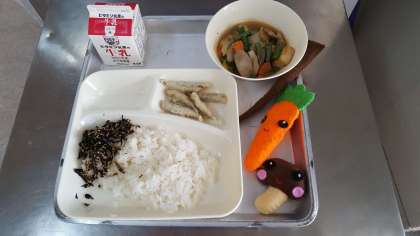 今日の献立は、いわし天ぷら・ごまひじき・厚揚げと野菜の煮物・ごはん・牛乳です。
