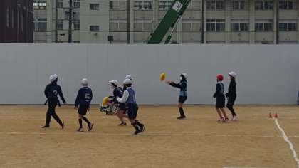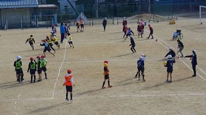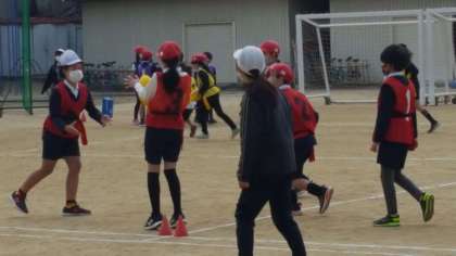 4年生は、体育の授業でした。タグラグビーの練習と試合の様子です。華麗なパス回しの後、試合を行いました。子ども達は、練習の成果を試合で発揮していました。