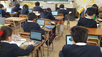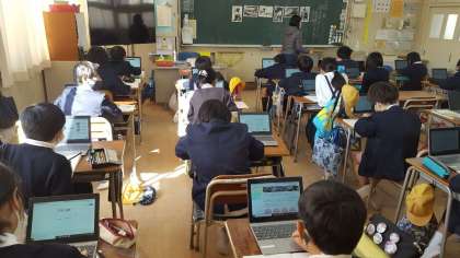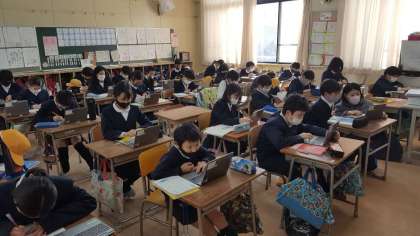 5年生は、国語の授業でした。パソコンを使って、調べ学習をしていました。それぞれ個人用のパソコンを使っていました。卒業するまで使うので丁寧に使いましょうね。