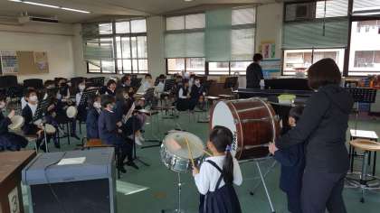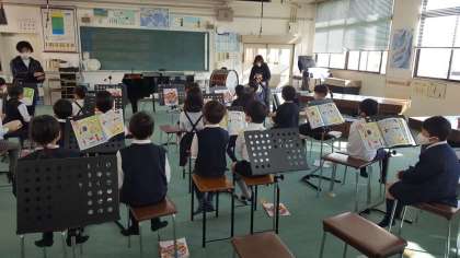 1年生は、音楽の授業でした。音楽室で打楽器の使い方を学習していました。友だちが打ったリズムを、全体で合わせていました。みんなしっかり聞きとって、それぞれの打楽器を叩いていました。