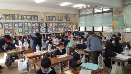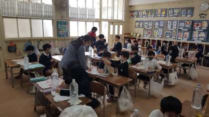 2年生は、生活科の授業でした。赤ちゃん人形を作っています。ペットボトルに水を入れ、それを土台にしてそれに着せる服を作ります。タオルを切り抜いて服を作っています。