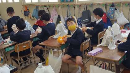 服ができたら、次に頭を作ります。綿を丸めて布で包んで頭にします。それに目や鼻や口をつけていきます。楽しみですね。