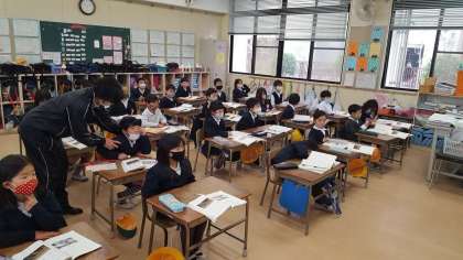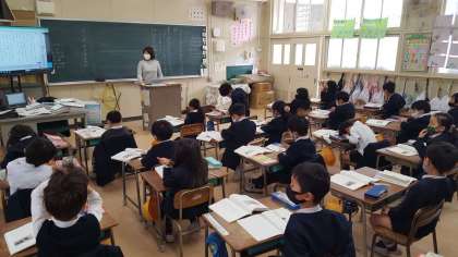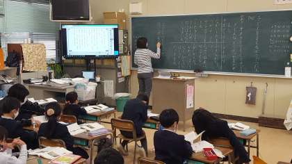 1年生は、国語の授業でした。説明文の読み取りをしていました。動物の使う知恵について考えていました。難しい内容ですが、がんばって読み取っていました。
