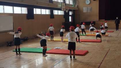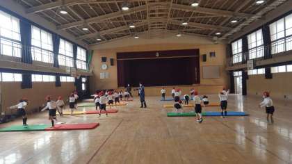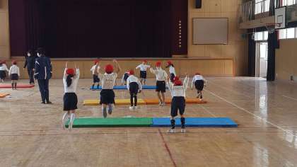 1年生は、体育の授業でした。講堂で立ち幅跳びの練習をしていました。みんな手を大きく振って勢いをつけて跳ぶ練習をしていました。いい記録が出るといいですね。