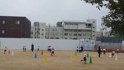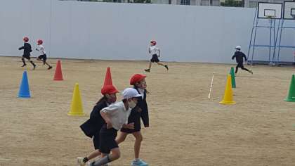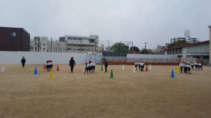 1年生は、体育の授業でした。雪のちらつく寒い中、持久走をしていました。その後折り返しリレーをしました。体を動かして温かくなったかな。