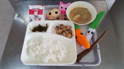 今日の献立は、マグロの甘辛焼き・豚汁・くきわかめの佃煮・ごはん・牛乳です。