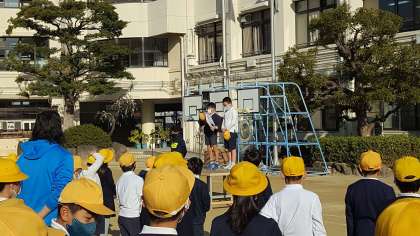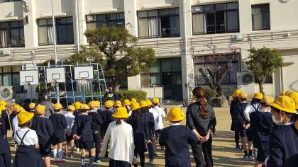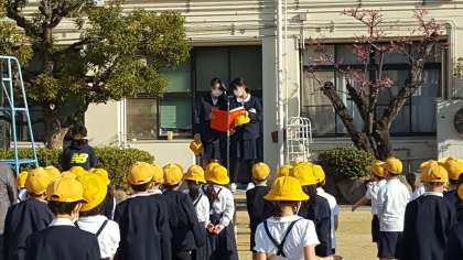 春を感じさせる暖かい日差しの中、全校朝会を行いました。校長先生からの三寒四温の話に続いて、看護当番から先週の反省と今週の目標についての話がありました。