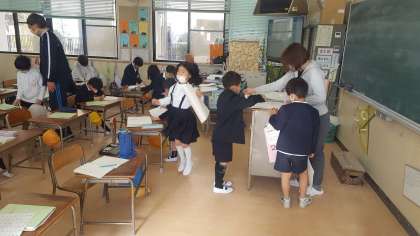 1年生の朝の会の様子です。返却物にシールを貼って返しているところです。いい点数だったのか喜んでいる子もいました。