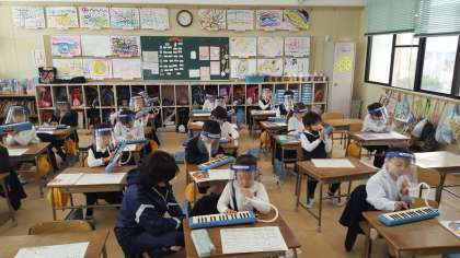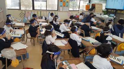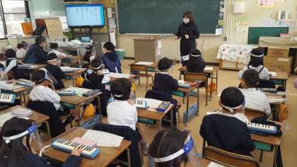 1年生は、音楽の授業でした。鍵盤ハーモニカを使って「こいぬのマーチ」の練習をしていました。個人個人で練習して、みんなで合わせていました。
