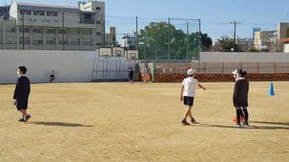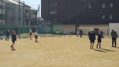 5年生は、体育の授業でした。キックベースボールの準備運動をしていました。今日は気持ちの良い天気です。楽しくがんばりましょう。
