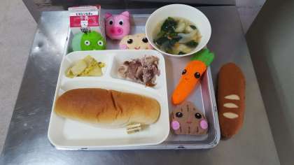今日のメニューは、豚肉のガーリック焼き・スープ・サワーソテー・コッペパン・バター・牛乳です。
