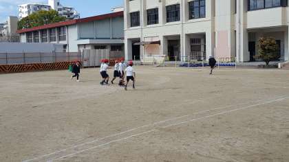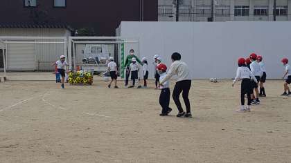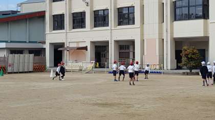 2年生は、体育の授業でした。冷たい風の吹く中、運動場でキックベースボールをしていました。チームワークがポイントのボール運動なので声を掛け合って試合をしていました。