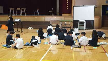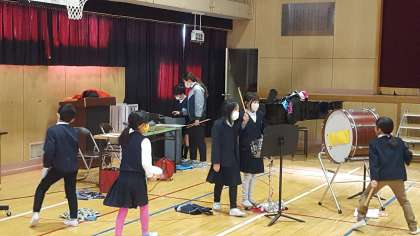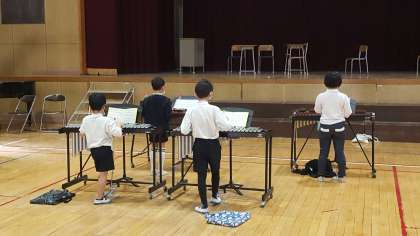 2年生は、音楽の授業でした。講堂で合奏の練習をしていました。パートごとに分かれて、部分練習をしていました。