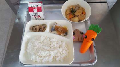 今日の献立は、さごしのおろしじょうゆかけ・れんこんの炒め物・一口がんもと里芋のみそ煮・ごはん・牛乳です。