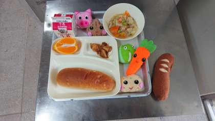 今日のメニューは、鶏肉のみそバターソース・スープ煮・デコポン・おさつパン・牛乳です。