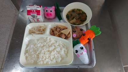 今日の献立は、豚肉のコチジャン炒め・トック・もやしのナムル・ごはん・牛乳です。