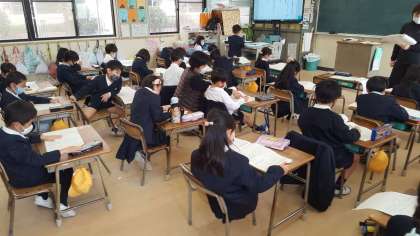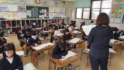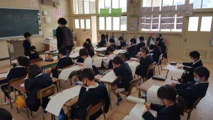 1年生は、国語の授業でした。テストの答え合わせをしていました。子ども達は、自分の答えを確認しながら、静かに先生の話を聞いていました。