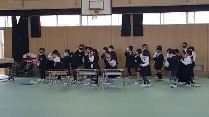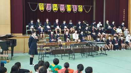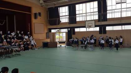 はじめの言葉の後、1年生からの出し物から会が始まりました。1年生は、言葉と合奏のプレゼントを贈りました。