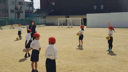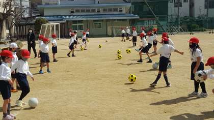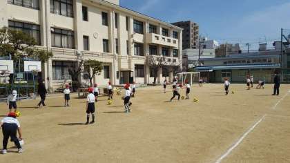 1年生は、体育の授業でした。ボール遊びをしていました。ボールをけってパスをする練習をしていました。パスされたボールをうまく止められず、走っている子が多くいたりして、ほのぼのした時間が過ぎていきました。