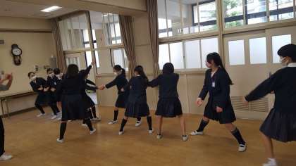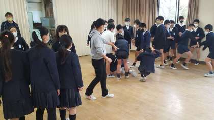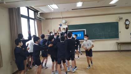 6年生は、C-NETによる最後の英語の授業でした。多目的室でジェスチャーゲームをしていました。英語で支持されたものをグループ対抗で表現していました。盛り上がっていました。1・2枚目の写真は、幼稚園の玉入れ・綱引きを表現しています。
