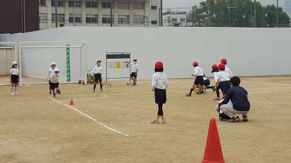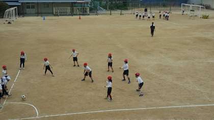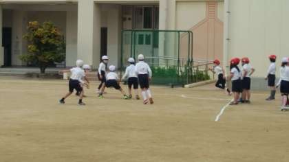 2年生は、体育の授業でした。キックベースボール形式のゲームをしていました。キック力も強くなり遠くまでける子もいます。もうすぐ3年生です。