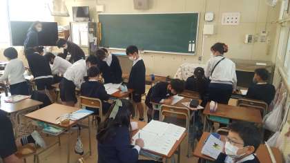 4年生は、算数の授業でした。問題の間違い直しをしていました。お互いに解き方を考えて教え合っていました。答えを教えるのではなく考え方を教えることは、どちらにとってもよいことですね。これからもがんばりましょう。