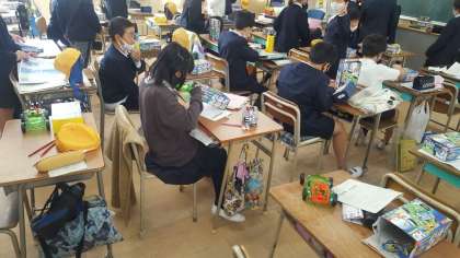 5年生は、理科の授業でした。1年間のまとめをしていました。使った実験キットを片付けて、カバンに入れたり、プリントを整理してファイルに綴じたりしていました。今まで学んできたことを活かして、6年生でもがんばりましょう。