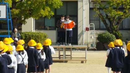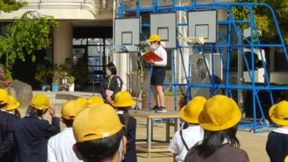 校長先生の話の後、看護当番から先週の反省と今週の目標についての話がありました。最後に、教室への入り方の確認をしました。