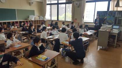 3年生は、外国語活動の授業でした。教室で算数の加減乗除の英語での表し方を学びました。