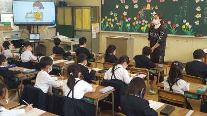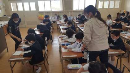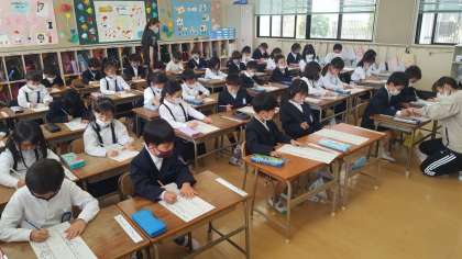 1年生は、国語の授業でした。初めて自分の名前をプリントに書いていました。お手本をよく見て、よい姿勢で1字ずつていねいに書いていました。