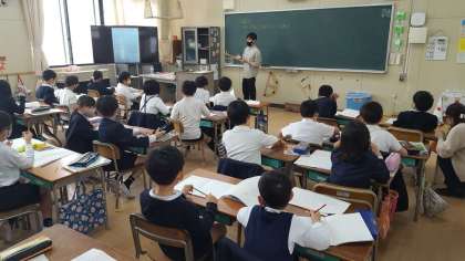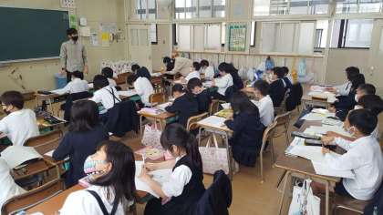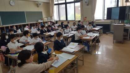 3年生は、社会の授業でした。みんなが住んでいる地域のことを学習していました。北を上にして、校区の地図を描いていました。