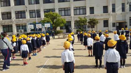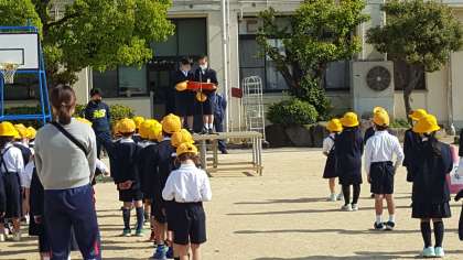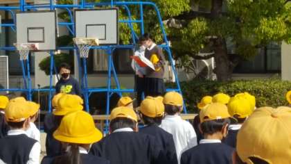 運動場で全校朝会を行いました。校長先生から、あいさつについてのお話がありました。続いて看護当番から、先週の反省と今週の目標について発表しました。