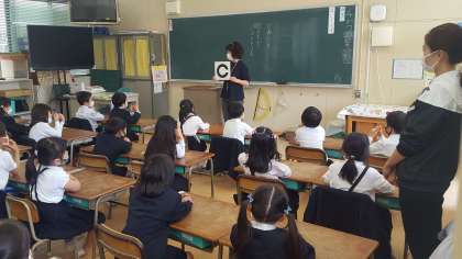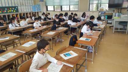1年生の視力検査の様子です。教室で養護教諭から検査の説明を受けて、ソーシャルディスタンスをキープするため、少人数で保健室で行いました。順番待ちの子ども達は、静かに教室で自習をしていました。