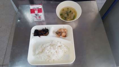 今日の献立は、鮭のごまみそ焼き・ひじきの炒め煮・五目汁・ごはん・牛乳です。