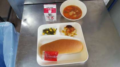 今日のメニューは、ケチャップ煮・サンド豆とコーンのソテー・りんごのクラフティ・コッペパン・イチゴジャム・牛乳です。