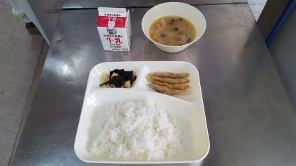 今日の献立は、きびなご天ぷら・豚汁・若竹煮・ごはん・牛乳です。