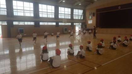 1年生は、体育の授業でした。講堂で、短距離走の練習をしていました。みんな、合図を聞いて元気にスタートしていました。