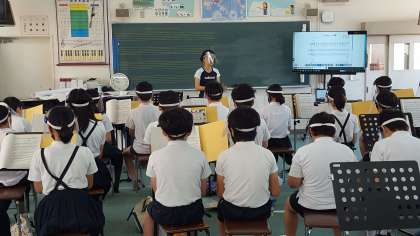 6年生は、音楽の授業でした。フェイスシールドをしてリコーダーの演奏をしていました。美しい音色でした。