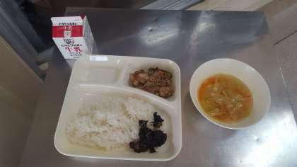 今日の献立は、豚肉のごまみそ焼き・すまし汁・海苔の佃煮・ごはん・牛乳です。