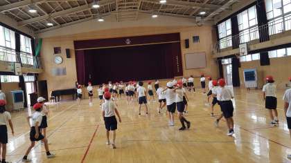 4年生は、体育の授業でした。講堂で、ドッジボールをしていました。王様ドッジをしていました。誰が王様かわからないので、みんなで協力して試合をしていました。