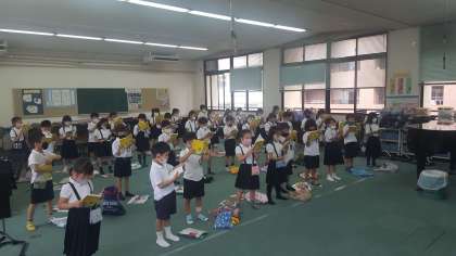 1年生は、音楽の授業でした。音楽室で校歌の練習をしていました。まだ歌詞を見ながら歌っています。歌詞もしっかり覚えましょうね。