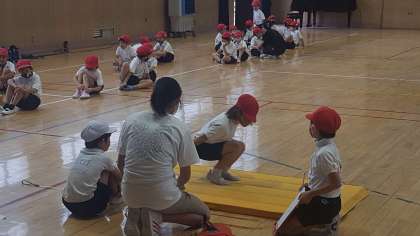 2年生は、体育の授業でした。講堂で、立ち幅跳びをしていました。自分の距離を伸ばすために、みんながんばっていました。
