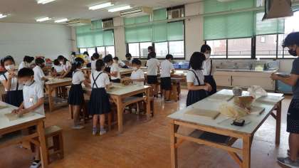5年生の図画工作の授業の様子です。陶芸をしていました。粘土を練っています。2色の粘土を混ぜてマーブルな作品になるらしいです。どのような作品になるのか気になりますね。