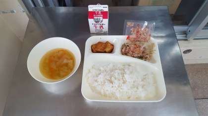 今日の献立は、ゴーヤチャンプルー・すまし汁・あつあげのしょうがじょうゆかけ・ごはん・牛乳です