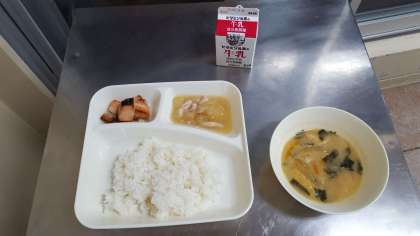 今日の献立は、鮭のつけ焼き・みそ汁・とうがんの煮物・ごはん・牛乳です。