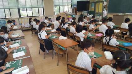 1年生の図画工作の授業の様子です。粘土で飾りを作っています。うまく丸めて団子を作ってつなげていきます。みんなの笑顔が印象的で、とっても楽しそうでした。