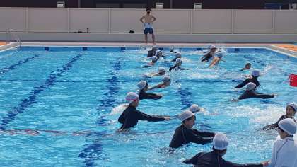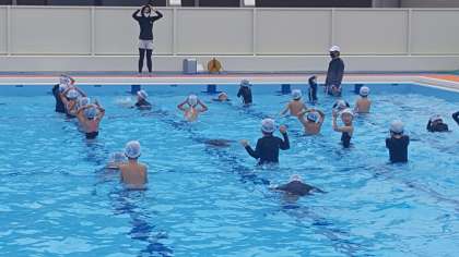 5年生の体育の授業の様子です。高学年になると泳ぐことが目標となってくるのでがんばりましょう。
