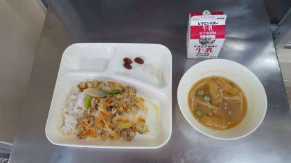 今日の献立は、他人丼・冬瓜のみそ汁・金時豆の煮物・牛乳です。