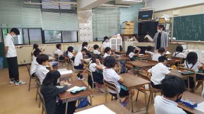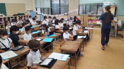 1年生の授業の様子です。タブレット端末を使っています。子ども達は慣れるのがすごく早いです。もう使いこなしている子がいます。
